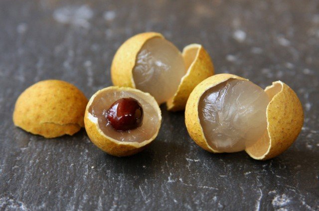 Чтобы раскрыть фрукт достаточно надавить на него двумя пальцами, и кожура лопнет пополам. В фрукте находится много железа, фосфора, витамина С. Лонган советуют употреблять в период умственной деятельности. Если переесть, то может слегка повыситься температура тела. Поэтому не злоупотребляйте им. Собирают плоды с мая по октябрь.