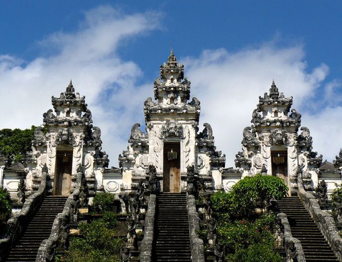 Остров Бали — оплот индуизма в центре мусульманской Индонезии. Если на соседних островах вашему взору предстанут в основном мечети, то на Бали своим разнообразием поражают индуистские храмы. Зачастую Бали называют островом богов, доля правды в этом есть, ведь местные жители искренне верят в существование духов, готовя им вкусные подношения несколько раз в день. Если говорить про храмы Бали, то их точное количество неизвестно, наверное, даже самим балийцам, потому что в каждой деревне по правилам должно находиться минимум три храма — один Pura Puseh, который строится в чистой части деревни, второй Pura Desa, располагающийся в центре деревни для проведения основных мероприятий и являющий центром культурной и религиозной жизни, ну и третий — Pura Dalem, т.е. храм смерти, где проводят ритуалы, связанные с погребением умерших. Более того, во дворе каждой семьи еще расположены «домашние» храмы предков.